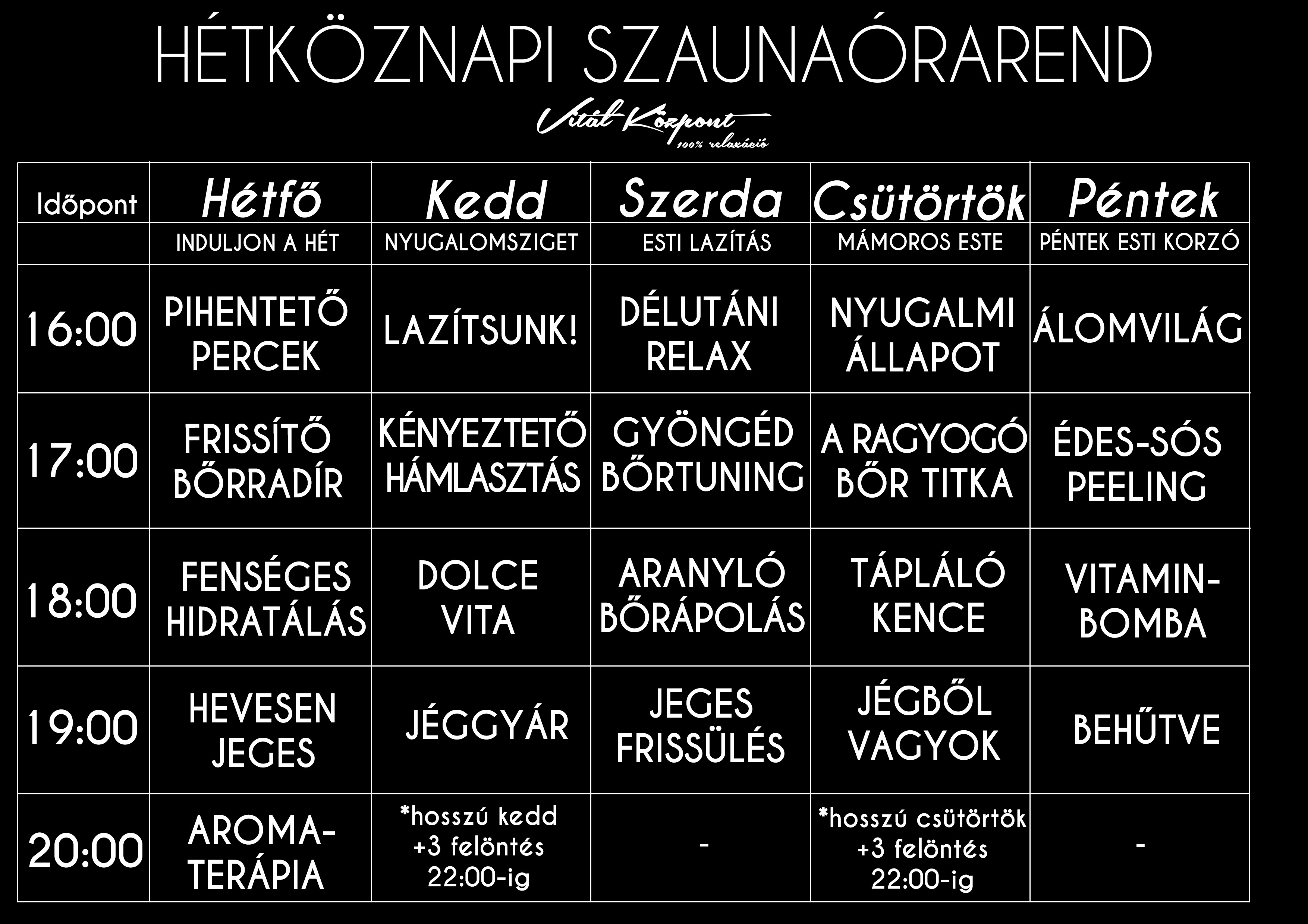 Valódi relaxációs és egészségmegtartó programokat kínálunk nemcsak a szaunaesteken és hétvégéken, hanem a hétköznapokon is. Szaunázzunk minél többet, mert a szaunázás élettani hatásai az általános fizikai és szellemi jólétünket is befolyásolja! Változatos felöntések és illatok, parajdi sós, citromos és mézes bőrápolással. A programok korlátlanul látogathatók Vitál Zóna-, Komplex Zóna-, Super Day Spa vagy Day Spa jeggyel. A Tenebris és a Solaris szaunában kérjük a szaunalepedő vagy a szaunaruha használatát, az egészséges szaunázás jegyében, a Vitál Központ egyéb részlegei fürdőruhában látogathatók. Különböző típusú szaunaruhák kaphatók recepciónkon, férfi-, és női változatokban. Szaunalepedő használatot letét ellenében, korlátozott számban, a jegy mellé térítésmentesen biztosítunk. A Vitál Központban korlátlan Keve Gyöngye ásványvíz-, és gyógytea fogyasztást biztosítunk. A Vitál Központot érintő belépőjegyek, mint Vitál Központ-, Komplex Zóna-, Day Spa-, belépőjegyek az adott napon megtartott szaunaprogramokat tartalmazzák, melyek korlátlanul látogathatók, a szabad férőhelyek függvényében.