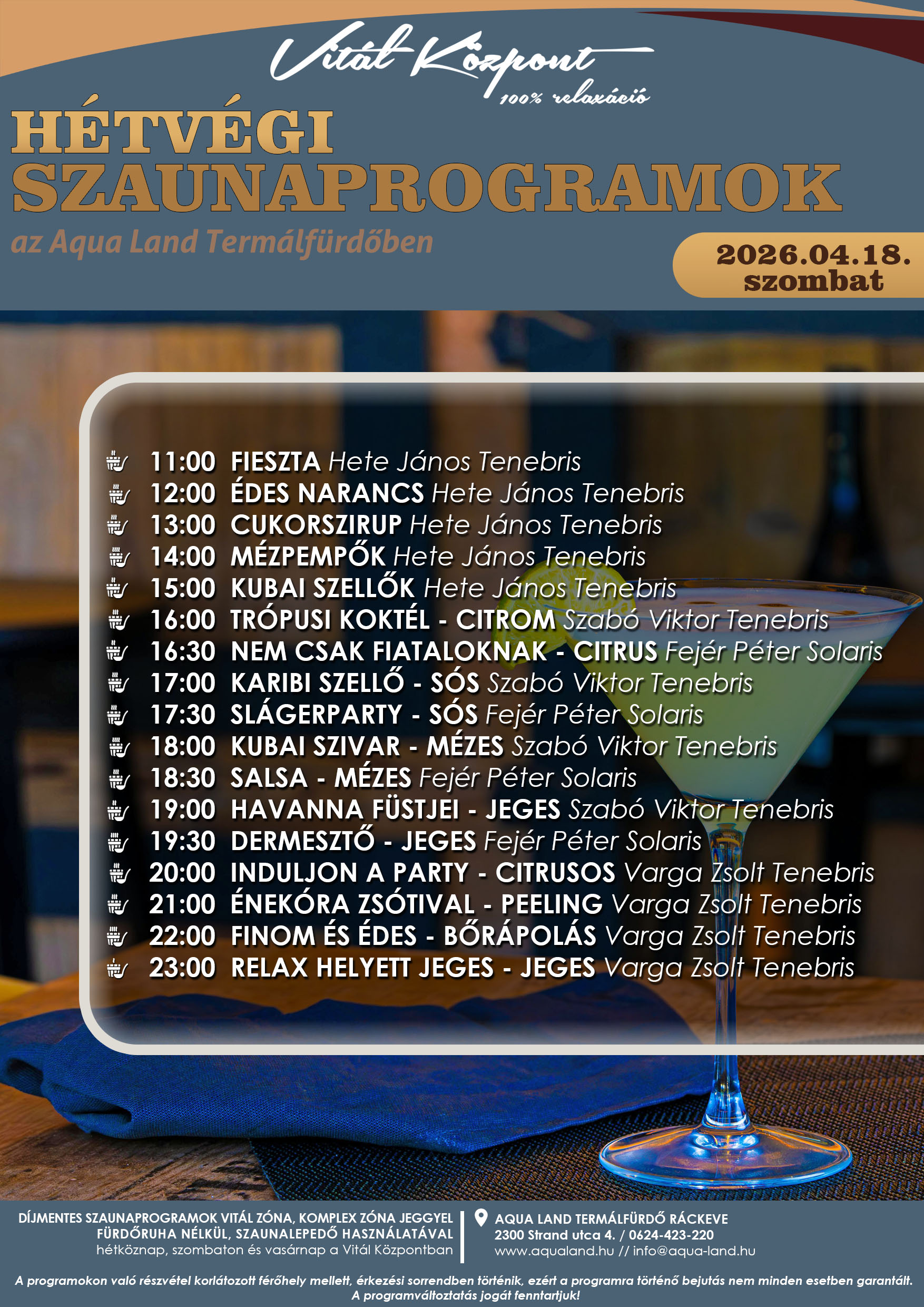 11.00 és 23.00 óra között, KUBAI tematikus hetünk inspirációjában, Hete János, Fejér Péter, Szabó Viktor, Varga Zsolt szaunamesterekkel.
